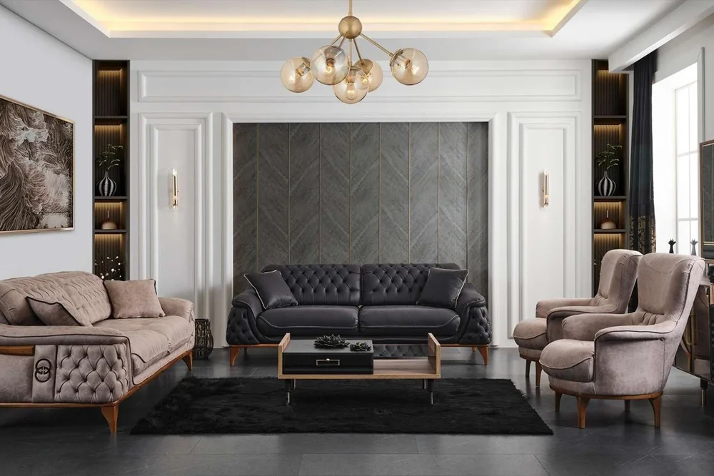 Lotus Nubuk Koltuk Takımı, zarif tasarımı ve fonksiyonelliğiyle yaşam alanınıza şıklık katıyor. Takım, 3+3+1 modüler yapısıyla esnek kullanım imkânı sunar ve ihtiyaca göre farklı parça kombinasyonlarıyla uyarlanabilir.